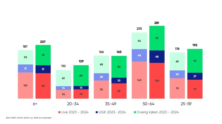Met 70,2% van de tv’s in Nederland die verbonden zijn met het internet en 35% van de huishoudens met een mediastreamer zoals Apple TV, staat ons een wereld aan mogelijkheden ter beschikking. Vooral jongeren brengen een groot deel van hun kijktijd door op online videoplatformen zoals Netflix en Disney+.Dus hoewel de lineaire kijktijd daalt blijft het grote scherm dominant, mede dankzij de digitale ontwikkelingen, met een aanzienlijke dagelijkse kijktijd.