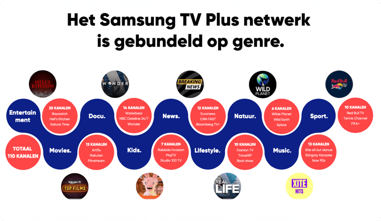 Hierdoor kunnen we onze online video-inventory uitbreiden met maar liefst 65-70% extra inventory op het grote scherm. Dit betekent meer mogelijkheden voor adverteerders om hun boodschap over te brengen in een premium video-omgeving. Met meer dan 100 kanalen, van entertainment en lifestyle tot sport en kids, biedt het Samsung TV Plus netwerk voor ieder wat wils. Daarnaast lanceren we binnenkort onze eigen kanalen, met unieke content en advertenties die perfect passen binnen deze nieuwe manier van tv-kijken.