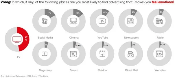 De kracht van emotie in beeld en geluid Emotie is cruciaal in video advertising, omdat het een verbinding creëert tussen kijker en merk. De combinatie van beeld en geluid in video’s maakt dit medium uitzonderlijk effectief voor het oproepen van emoties. Deze emotionele band trekt niet alleen de aandacht, maar maakt de boodschap ook onvergetelijk. TV-reclames, die vaak op grote schermen en in sociale settings worden bekeken, versterken hun impact en stimuleren gesprekken, wat bijdraagt aan merkbekendheid. Onderzoek toont aan dat TV-advertenties emoties opwekken, mensen laten lachen en populairder zijn dan andere media.