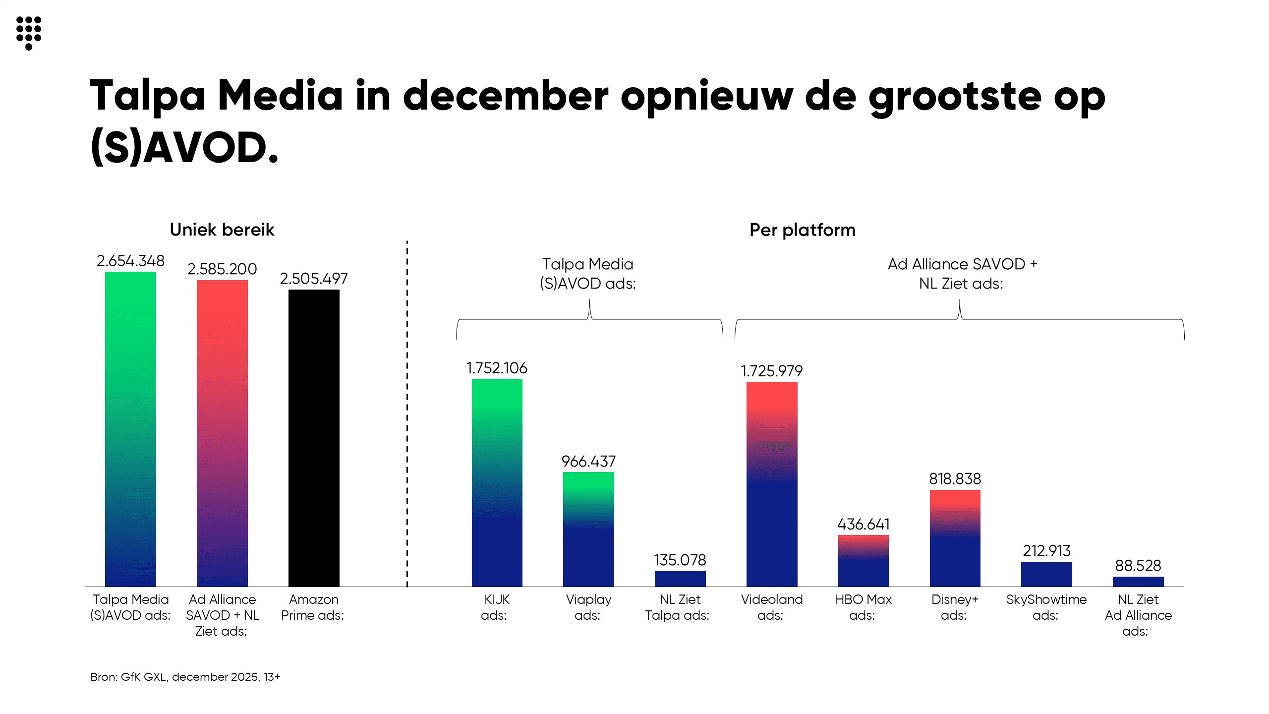 Volgens de meest recente GfK-meting in december heeft Talpa Media het grootste advertentiebereik binnen (S)AVOD in Nederland. Daarmee bieden we adverteerders direct een stevig fundament voor landelijke zichtbaarheid rondom long-form content.