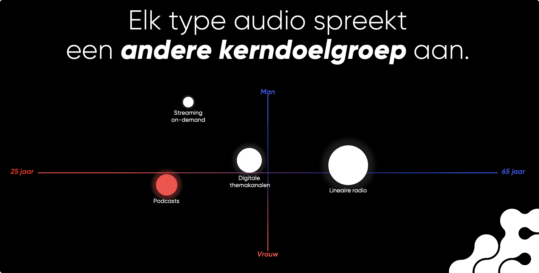 Elk type audio spreekt een andere groep aan. Podcasts zijn populair bij een jong publiek dat op zoek is naar verdieping en interessante verhalen.Digitale themakanalen trekken mensen die bewust kiezen voor bepaalde muziek of sfeer. En lineaire radio blijft vertrouwd een dagelijks onderdeel van het leven van miljoenen.