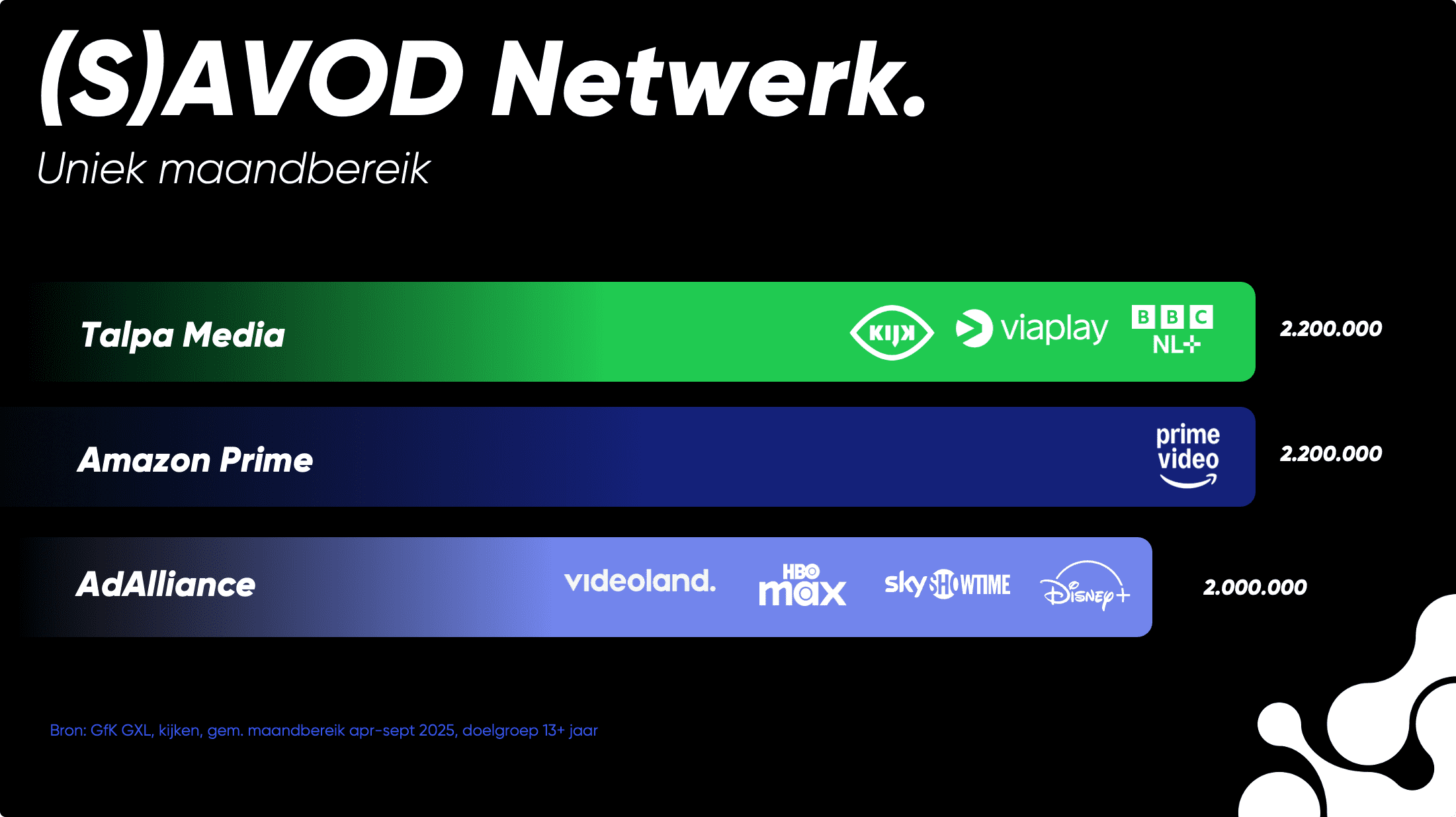 Als we inzoomen op het streaming-domein — waar mensen bewust kijken, vaak op het grote scherm, dan behoort Talpa Media met KIJK, Viaplay en BBC NL+ tot de grootste advertentieplatformen van Nederland.
