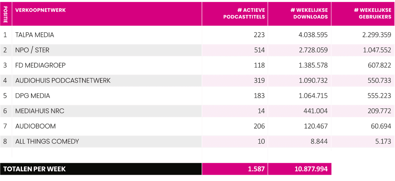 De toppositie is het resultaat van een reeks strategische samenwerkingen waarmee Talpa Media het podcastaanbod heeft uitgebreid. Sinds 1 juni is Talpa Media exclusief verantwoordelijk voor de verkoop van programmatic audio- en Run-of-Network (RON)-campagnes op de titels van Dag en Nacht Media en Tonny Media, beide onderdeel van Podimo. Met deze samenwerking voegt Talpa Media de grootste podcast advertentie-inventory van de markt toe aan haar total audio propositie. Dag en Nacht Media en Tonny Media behouden de exclusiviteit voor de verkoop van pre- en post-roll advertenties op geselecteerde podcasts, evenals de verkoop voor native- en host-read-advertenties. Eerder dit jaar werd de samenwerking gestart met Audiohuis (Mediahuis) tevens voor de verkoop van RON campagnes en meest recentelijk volgde de overeenkomst tussen One Media Sales (OMS) en AdsWizz voor de verkoop van audio inventory op SoundCloud en Sonos Radio in Nederland.