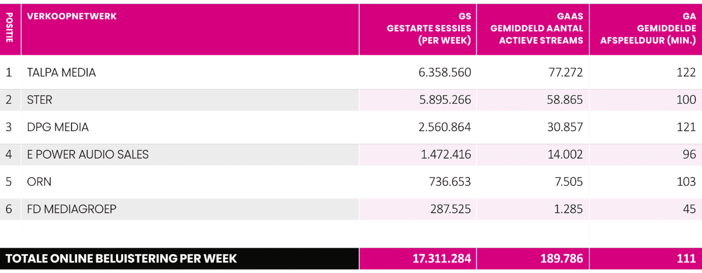 Hilversum, 18 september 2025 - Volgens de meest recente cijfers van het Nationaal Media Onderzoek (NMO, juli 2025) is Talpa Media met 37% marktaandeel en 4,04 miljoen wekelijkse downloads de onbetwiste nummer één in de Nederlandse podcastadvertentiemarkt. Ook op het gebied van streaming audio voert Talpa Media de lijst aan, met 6,35 miljoen (gestarte) sessies per week. Dankzij de krachtige combinatie van lineaire radio, streaming audio en podcasts heeft Talpa Media zich ontwikkeld tot de grootste total-audio-speler in het Nederlandse medialandschap.