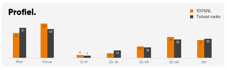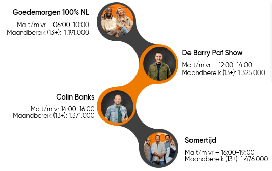 Met een mix van de grootste hits van eigen bodem, variërend van pop en rock tot levensliederen, brengt 100% NL je de muziek van nu en tijdloze klassiekers. De DJ's zorgen voor een warme en gezellige sfeer, met programma's die je dag opvrolijken en verbinden.