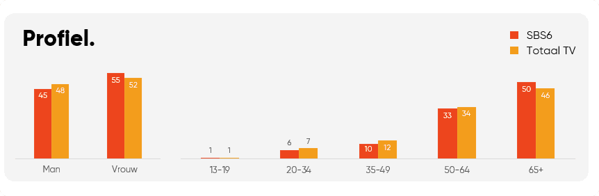 SBS6 is de meest uitgesproken publiekszender van Nederland. Wij brengen televisie die toegankelijk is en dicht bij onze kijker staat. Wij benoemen wat anderen niet doen en spreken duidelijke taal met een gezonde dosis humor. Wij hechten waarde aan traditionele normen en waarden en houden van Nederland. Onze programmering omvat reality, amusement, nieuws & opinie en drama. Elke dag zie je bij ons content die amuseert en informeert.