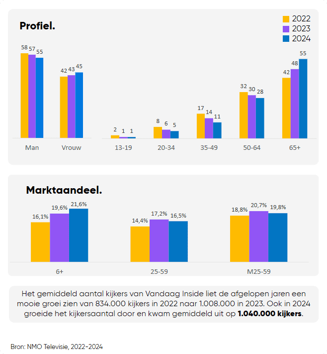 Vandaag Inside heeft inmiddels een vaste plek veroverd in de prime time van de Nederlandse televisie. Het programma groeide de afgelopen jaren naar een indrukwekkend gemiddeld marktaandeel van 21,6% (6+). Het aantal kijkers steeg van 834.000 in 2022 naar 1.008.000 in 2023, en zette die stijgende lijn door in 2024 met gemiddeld 1.040.000 kijkers.